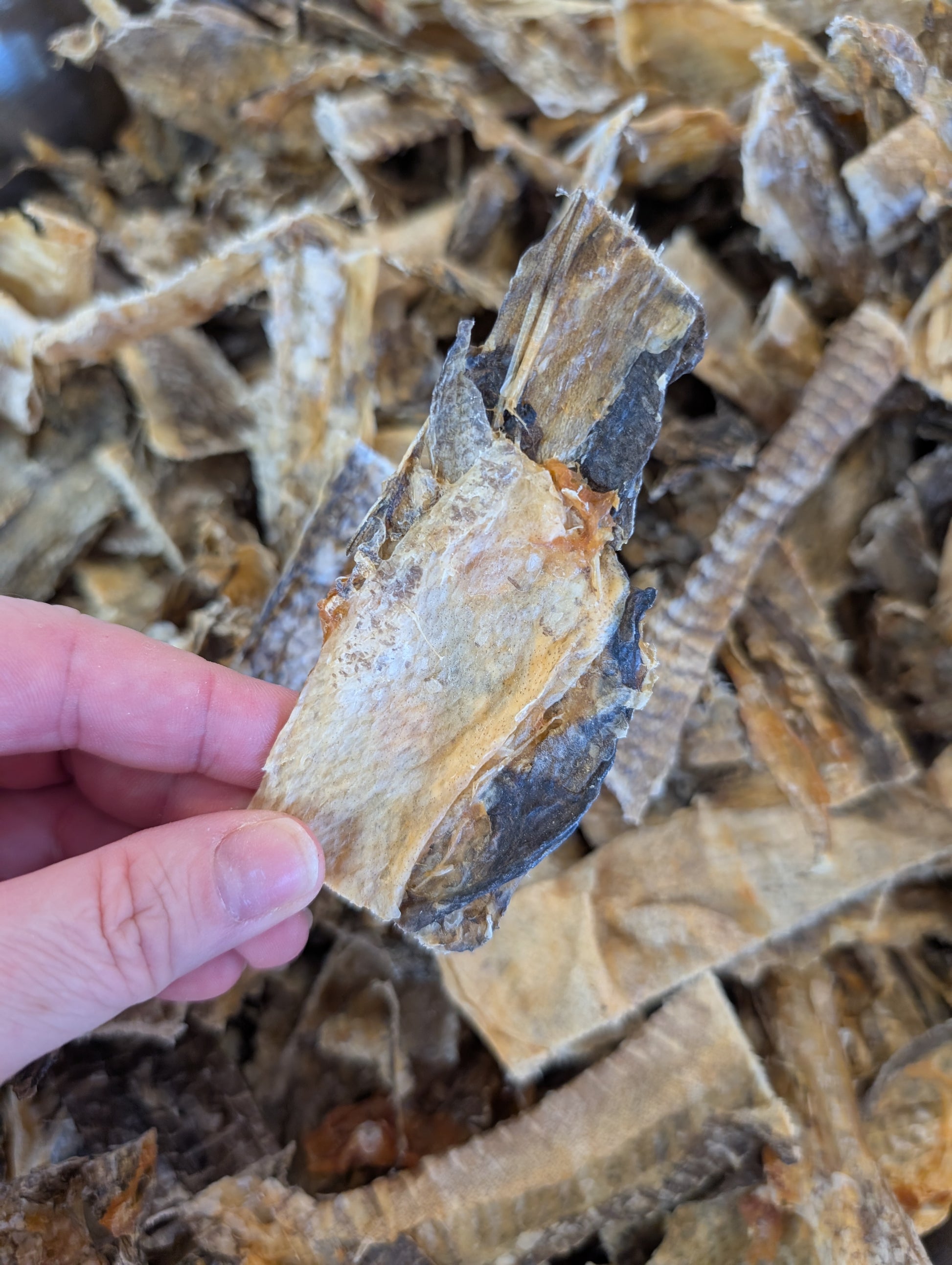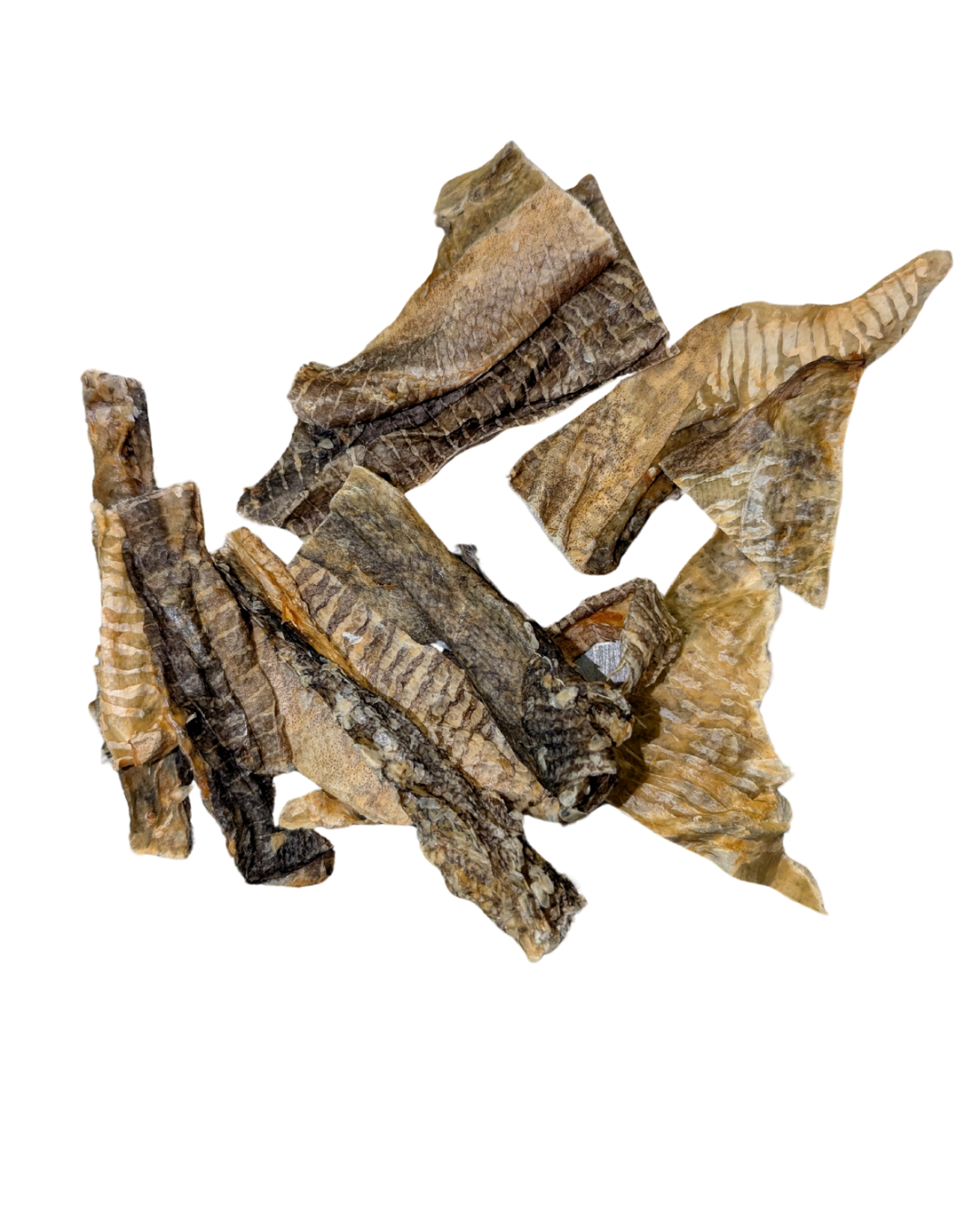 These air dried Cod Skins are simply delicious! The rough texture of these bite sized cod skins are great for dental health.