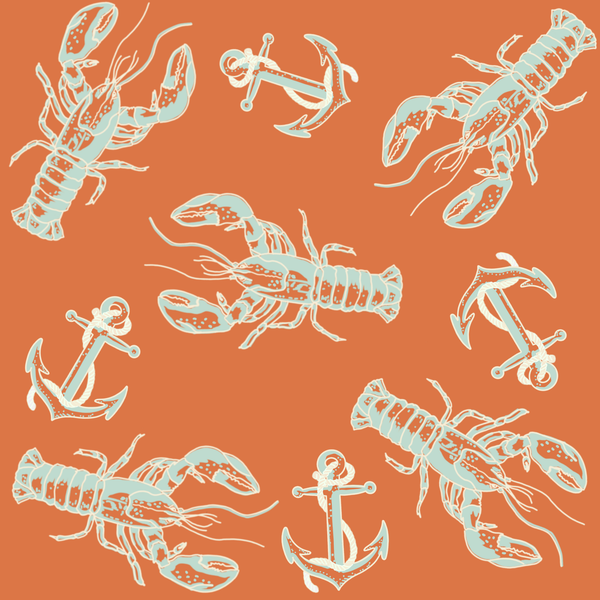 From down the shore. Aqua lobsters and anchors on a terracotta background. Hand-drawn inhouse!